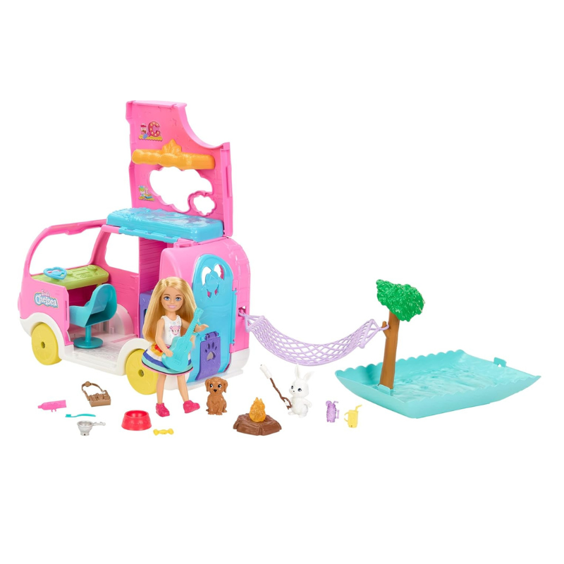 - Chelsea doll brings her puppy and bunny along, with extra accessories like a campfire, guitar, and food.