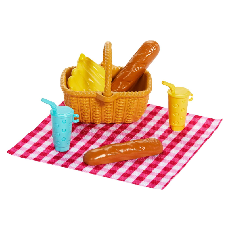 - Nine picnic-themed accessories include a basket, blanket, two drinks, and food items like baguettes and a banana bunch to inspire imaginative storytelling.