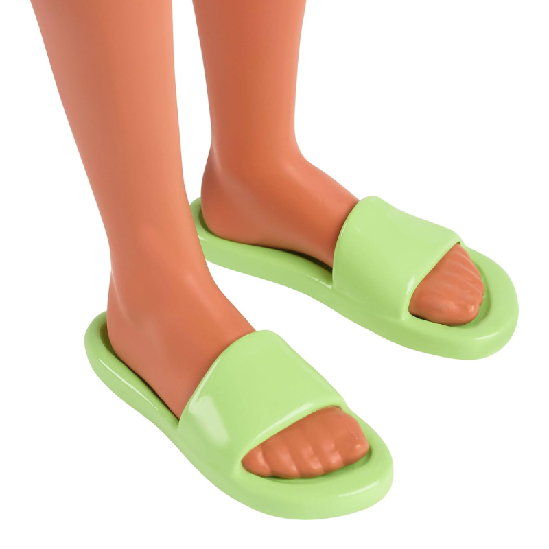 - Outfit Details: A tropical jumpsuit paired with bright green sandals for a fun, beach-ready vibe.