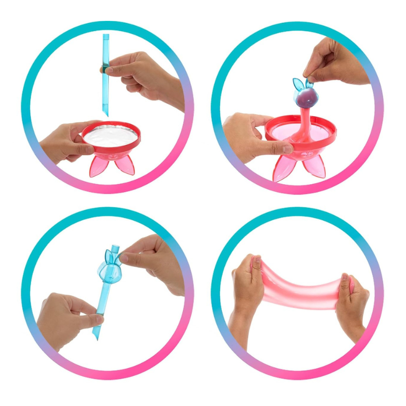 - Unscrew the animal-ear lid filled with shimmery slime and use the straw to poke through the film to discover the squishy fun inside!