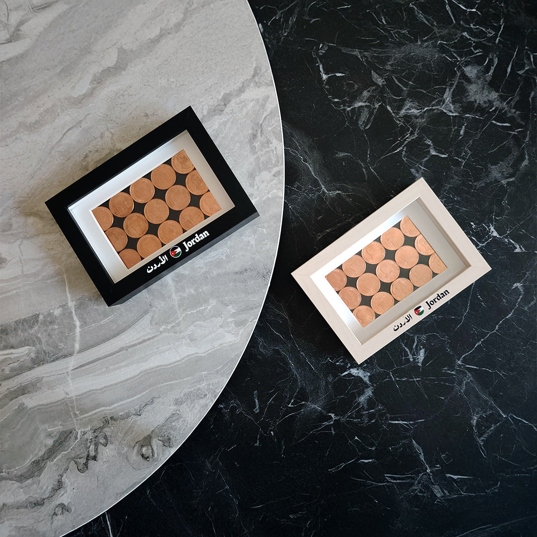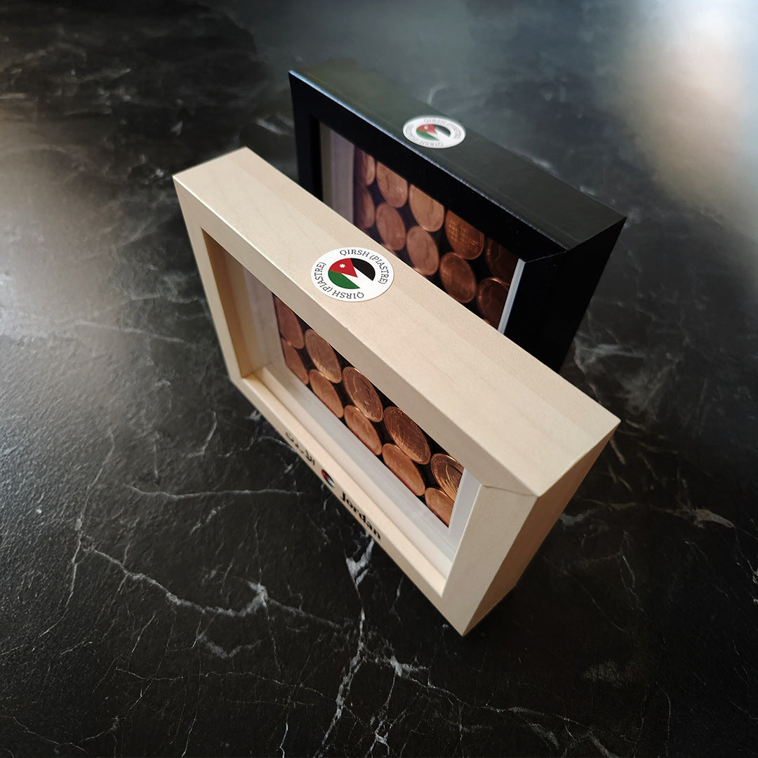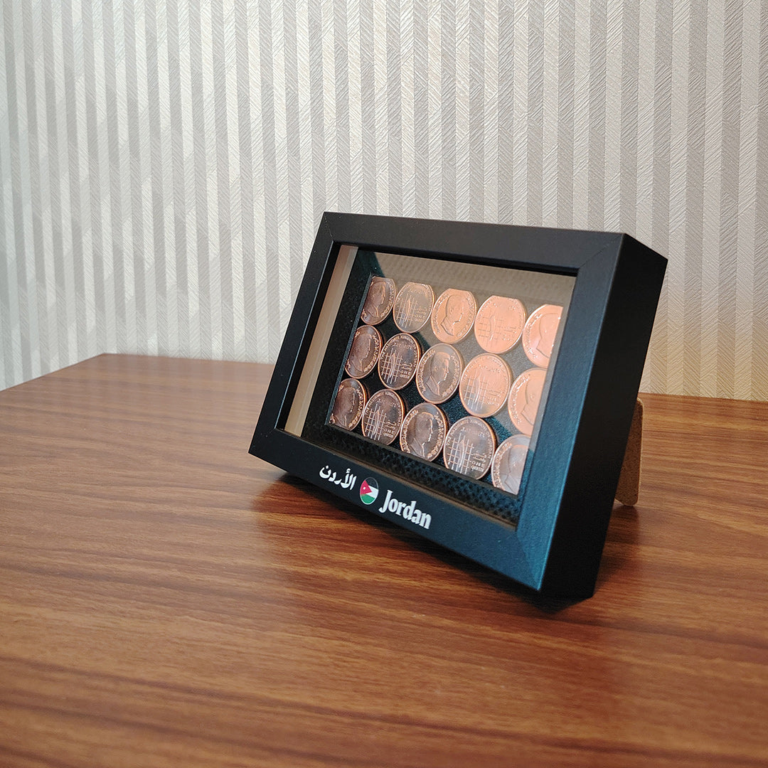 The Qirsh (Piastre): A genuine Jordanian Qirsh coin, beautifully presented in a collector-grade display case. Each piece comes with a brief insight into its significance, offering a tangible link to Jordan's rich monetary history. A sophisticated memento for numismatists and admirers of heritage."Tithkar" Collection by Lafita: Encapsulating the Soul of Jordan, Forever Framed.
