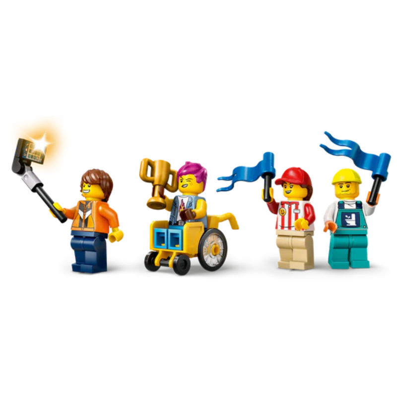 Get ready for high-flying, toilet-flushing, hot-dog-fueled fun! This LEGO® City race ramp set brings wild characters and wackier vehicles together for hilarious racing action that kids will love.