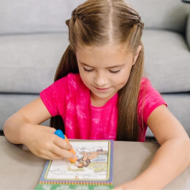 This Water Wow! coloring book includes 4 reusable pages along with a refillable water coloring pen that creates no mess. Use the pen to color the pages and watch the colors appear, filling the pages with joy with every stroke you make! Afterward, let the pages dry so the images “disappear,” allowing you to color them again and again. The book features pages with different shapes to color (circles, triangles, squares, and rectangles), and the scenes include fun facts and an engaging seek-and-find activity.