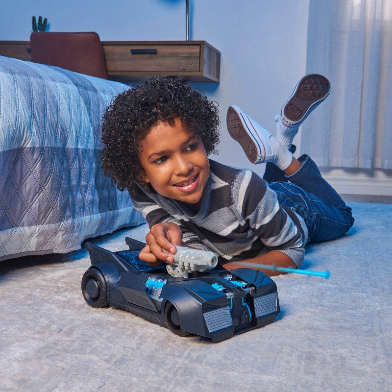 - Transforming Batmobile: Push the cockpit door down to activate battle mode with a blaster launcher, or pull it back up for stealth mode.