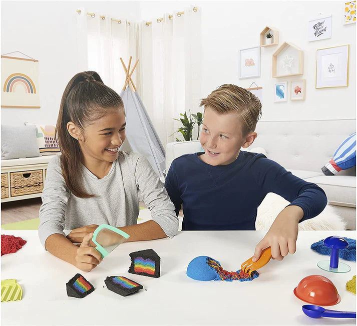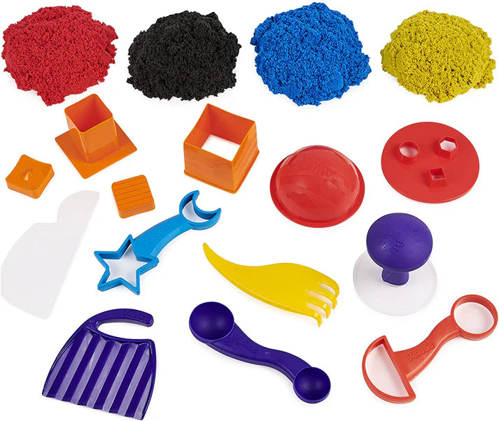 Mix, shape, slice, and squish with the Kinetic Sand Sandisfactory Set! This 2lb Kinetic Sand kit comes with red, blue, yellow, and rare black sand, plus over 10 tools and molds for endless creative possibilities. Fluff the sand to get it flowing, then mix colors, mold designs, cut, scoop, and squish to reveal surprising shapes and patterns. Perfect for sensory play, fidgeting, and imaginative creation, Kinetic Sand never dries out and is made from natural, non-toxic materials.