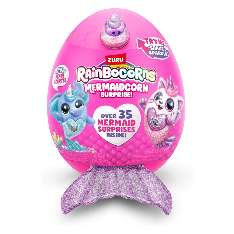 Dive into the magical world of Rainboville with Mermaidcorns, cuddly plush friends with glittery mermaid tails, water globe horns, and over 35 surprises waiting to be discovered!